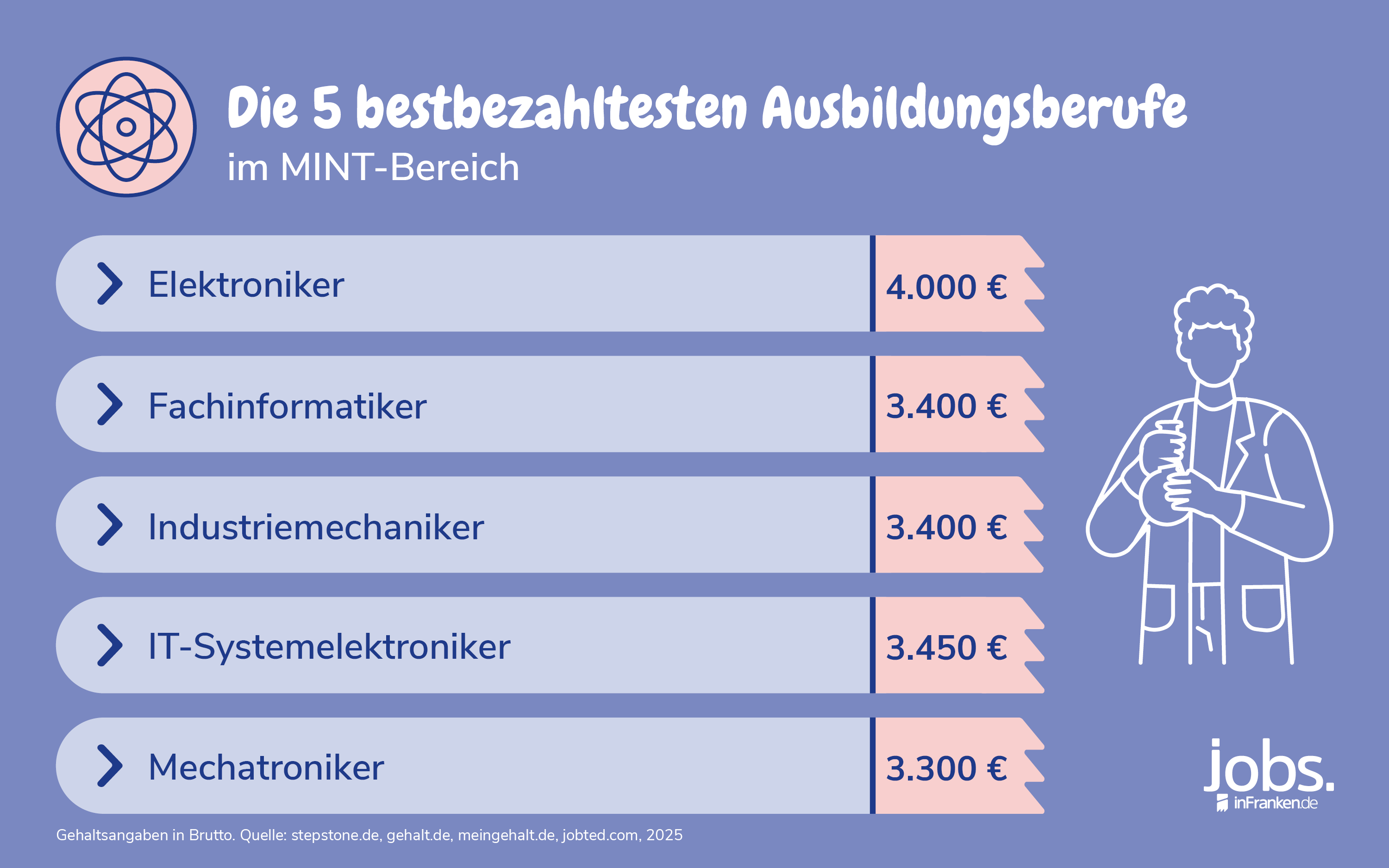 Das durchschnittliche Gehalt während einer Ausbildung in einem MINT-Beruf variiert je nach Branche und Beruf. Das monatliche Ausbildungsgehalt liegt je nach Beruf und Ausbildungsjahr zwischen 900 und 1.300 Euro brutto. In tarifgebundenen Betrieben (Chemie, Metall/Elektro) sind die Vergütungen oft höher.