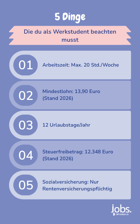Du studierst in der Region Franken und suchst nun einen Werkstudentenjob? Die Möglichkeiten im Frankenland sind vielfältig. Über 100 offene Stellen für Werkstudentenjobs findest du aktuell auf unserem Portal. Doch was genau kann man sich unter so einem Job vorstellen, wie viele Stunden darfst du arbeiten und wie viel Geld verdient man mit einem Studentenjob?